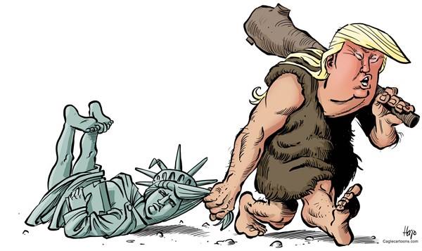In my opinion the cartoon is supposed to criticize Donald Trump strongly. The fact that he is depicted as a Neanderthal man with a club conveys that he is a primitive, brutal and vulgar man. His stupid facial expression together with his ridiculous hair reinforce this impression.