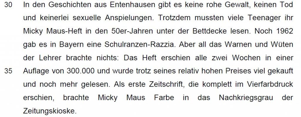 In dem Zieltext soll es ganz allgemein um Mickey Maus Hefte in Deutschland gehen. Wie immer soll man sich der „relevanten Informationen der deutschen Textvorlage bedienen“. Ist „unter der Bettdecke lesen“ relevant? Oder die Auflage, der relativ hohe Preis oder ist das eher unwichtig im Vergleich zum Vierfarbdruck?